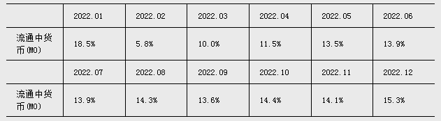 注4:自2022年12月起,“流通中货币(M0)”含流通中数字人民币。12月末流通中数字人民币余额为136.1亿元。修订后,2022年各月末M1、M2增速无明显变化。修订后M0增速如下:
