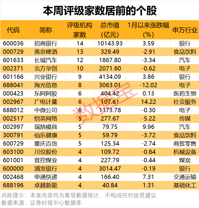 机构关注度最高的是招商银行,有14家机构对其评级;紧随其后的是燕京啤酒、长城汽车和北方华创,均有10家及以上机构评级。另外,海光信息、中微公司、鼎龙股份、中石科技、晶丰明源等电子股均有2家及以上机构关注。总的来看,共58股获2家及以上机构关注。