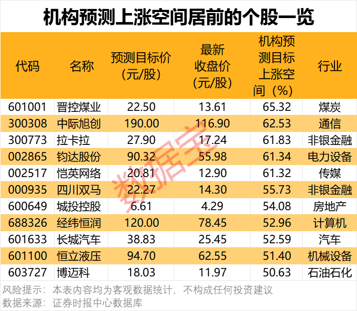 本周机构评级的个股中,11股最新收盘价较机构预测目标价上涨空间超50%,其中晋控煤业上涨空间65.3%。