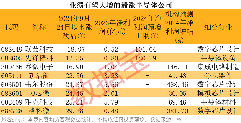 进一步来看,自2024年9月24日以来,申万二级半导体指数累计涨65.5%。半导体行业公司中,自2024年9月24日以来涨幅低于30%,且2024年净利润增幅上限超过30%(或机构预测2024年净利润增幅超过30%)的公司仅有8家。