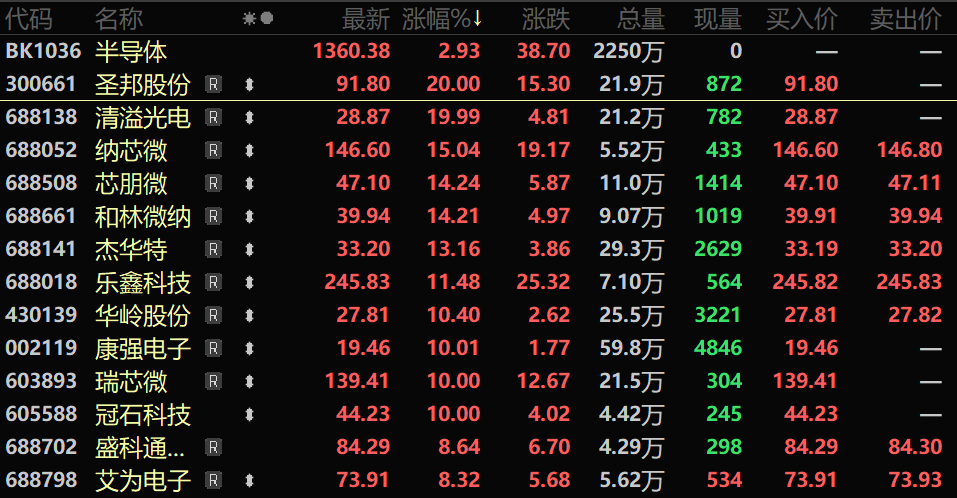 1月17日,总市值超过4万亿元的半导体板块全面爆发,霸榜板块涨幅前3名,申万二级半导体行业中,圣邦股份、清溢光电“20cm”强势涨停,康强电子、瑞芯微“10cm”涨停,其中圣邦股份、清溢光电均为近3个月以来首次涨停。