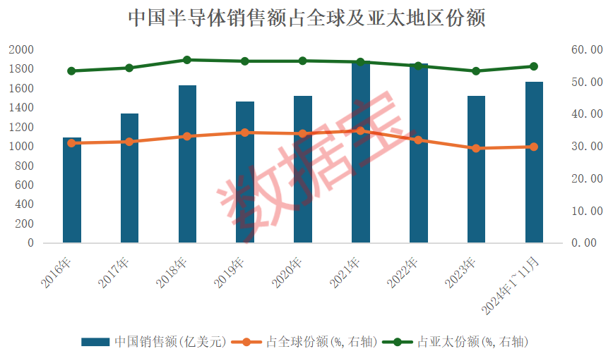 中国已连续多年成为全球最大的半导体市场。据美国半导体行业协会统计,2016年至2022年,中国半导体销售额占全球比重均超过30%;2023年以来,尽管销售额占比略有下降,但依然处于高位。2024年1~11月,中国半导体销售额达到3045.1亿美元,超过2023年全年,占全球销售额比重接近三成,占亚太地区半导体销售额比重54.65%。