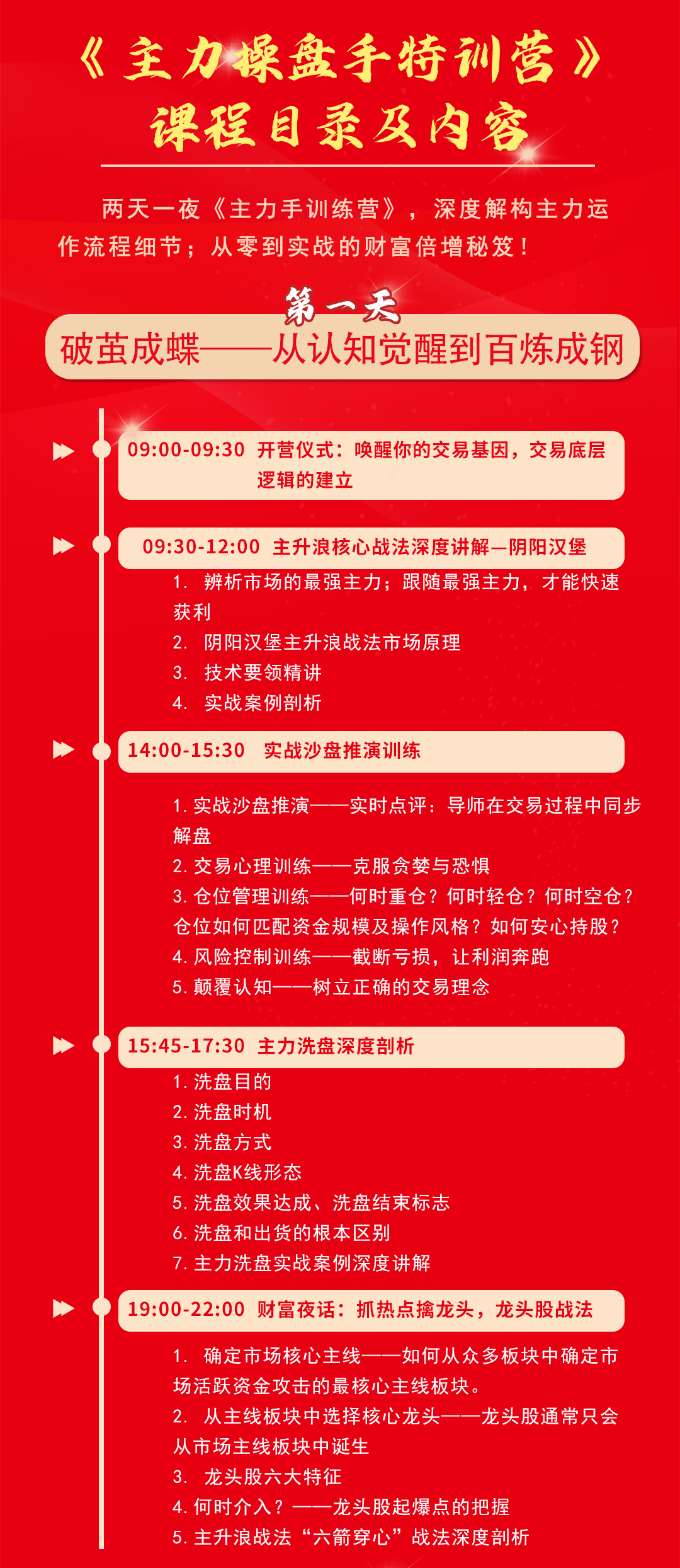 《主力操盘手特训营》,国内顶尖而最具实战型的金融投资课程,高度浓缩的完全仿真的证券投资市场体验,深度揭示金融证券和期货市场的真相和规律,彻底呈现你投资失败的根本原因和人性的弱点,通过两天一夜的完全真实的金融证券市场的深度体验式学习,您的投资思路,投资技法,投资心态将有脱胎换骨式的变化。