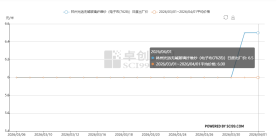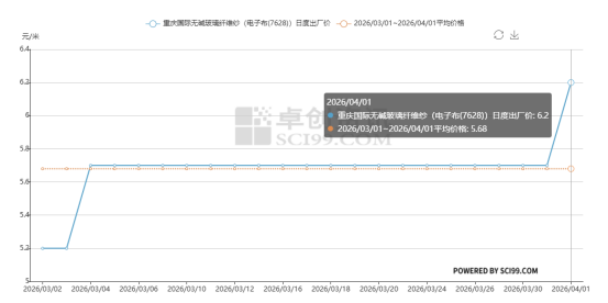 卓创资讯监测数据显示,4月1日,河南光远新材(图中“林州光远”为公司曾用名)7628电子布出厂价为6.5元/米,已较3月整体提价0.5元/米;国际复材(图中重庆国际)7628电子布出厂价现为6.2元/米,3月均价为5.68元/米。