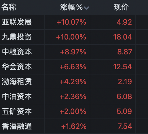 九鼎投资涨停,中粮资本、华金资本涨超5%。
