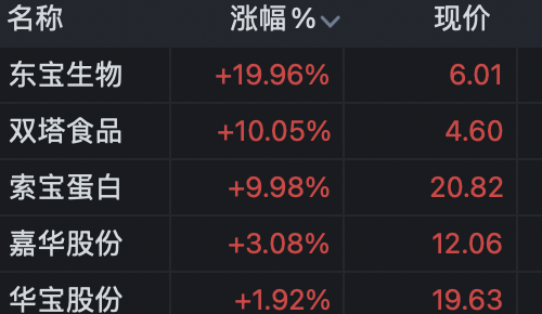 东宝生物、双塔食品、索宝蛋白涨停。