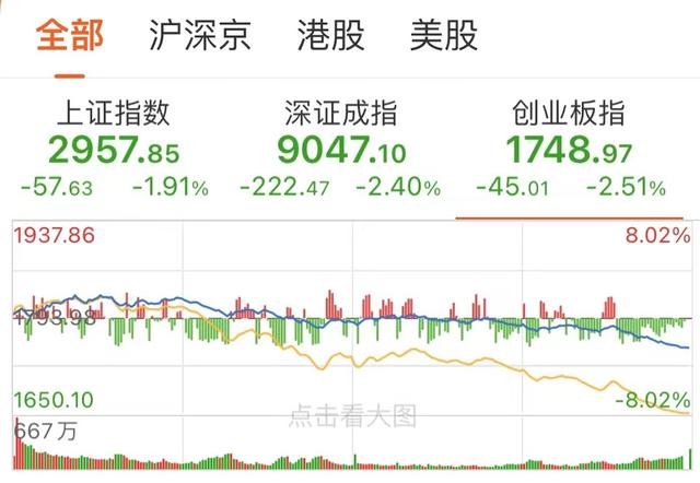 2月28日周三,A股三大指数今日冲高回落,尾盘加速跳水,创业板指领跌。截至收盘,沪指跌1.91%,报2957.85点;深成指跌2.40%,报9047.10点;创业板指跌2.51%,报1748.97点。