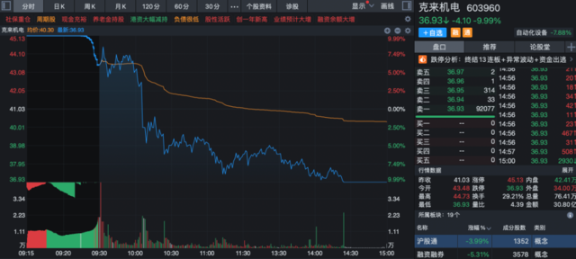 高位股全线下挫,13连板人气股克来机电跌停,康尼机电、傲农生物、汉马科技、南方精工等上演天地板,亚世光电、睿能科技等多股跌停。