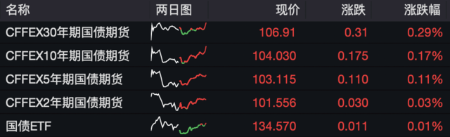 国债期货收盘,30年期主力合约涨0.29%,10年期主力合约涨0.17%,5年期主力合约涨0.11%,2年期主力合约涨0.03%。